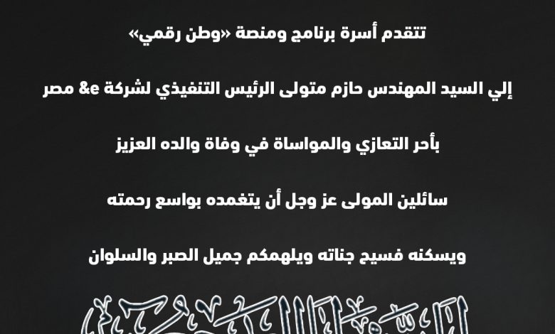 بقلوب يملؤها الحزن والأسى، تتقدم أسرة برنامج ومنصة “وطن رقمي” بأحر التعازي والمواساة إلى السيد المهندس حازم متولي، الرئيس التنفيذي لشركة e& مصر، في وفاة والده المغفور له بإذن الله. نسأل الله أن يتغمد الفقيد بواسع رحمته، ويسكنه فسيح جناته، ويلهم أهله وذويه الصبر والسلوان.